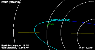 Em primeiro lugar, deve notar-se que se trata de dois objetos completamente diferentes. O asteróide (23187) 2000 PN9, realmente, atravessa a órbita da terra em meados de março, mas a uma distância de 0,118 unidades astronômicas. Uma unidade astronômica é de 150 milhões de quilômetros. Como MOID (distância mínima de interseção da órbita) a NASA dá 0,0133 UA, que ainda é muito. Aqui está uma imagem da órbita em 2011/03/09: